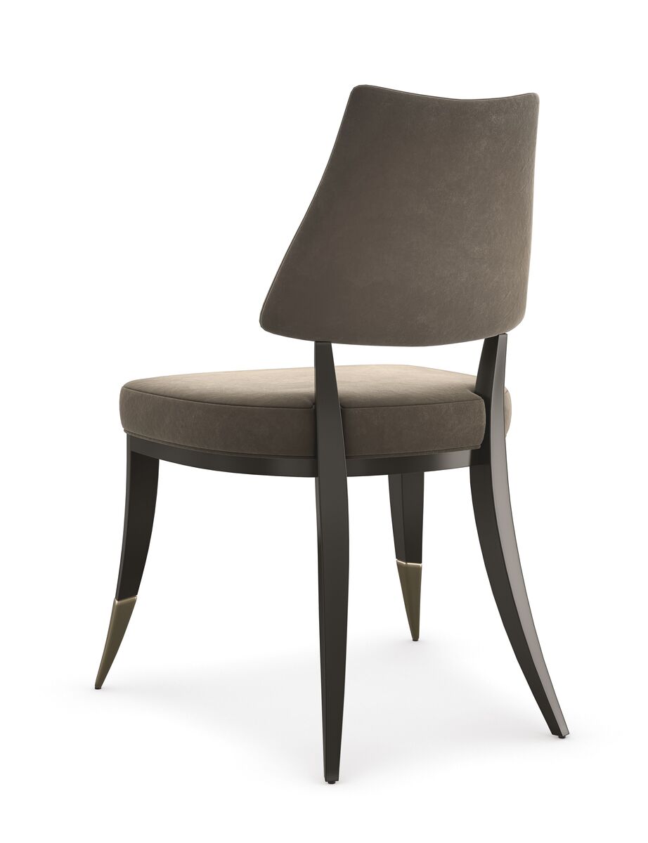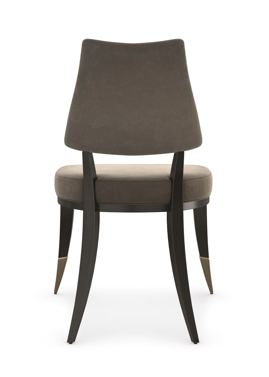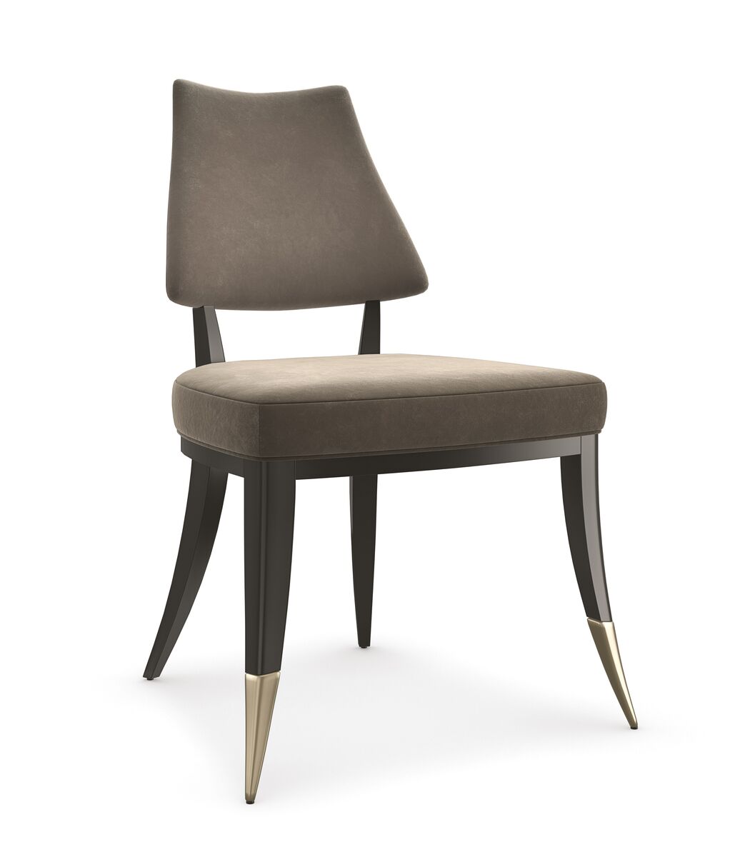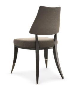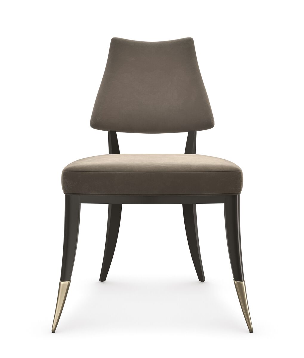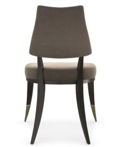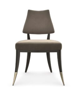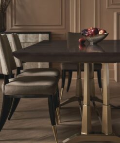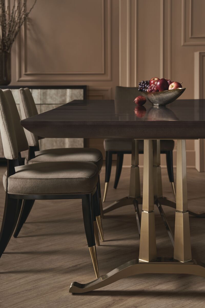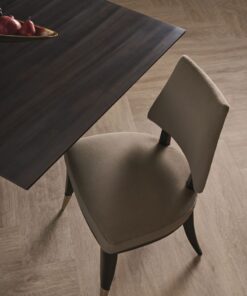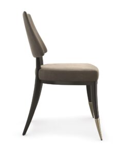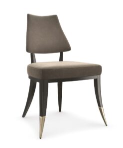 Stilingas valgomojo krėslas pasižymi minkštu, skulptūrišku atlošu ir pliušine sėdyne, puikiai tinkančia linksmiems ir ilgiems pokalbiams prie stalo. Aukštos, siaurėjančios kojelės su išlinkimu į išorę puikiai papildo šį lengvą siluetą, nepriekaištingai aprengtą dūminio pilkšvo aksomo audiniu. “brushed Gold” spalvos metaliniai apvadai suteikia prabangų akcentą.