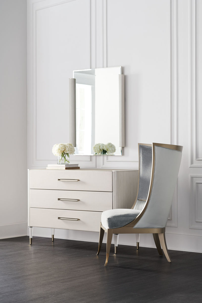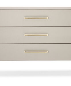 Nepamirštama iš bet kokios perspektyvos, ši stilinga komoda jus sužavės iš pirmo žvilgsnio. Meilės istorija prasideda įkvepiančiu medžiagų deriniu. Unikalūs gofruoti šonai ir tekstūruoti stalčių fasadai atgyja “Whisper Of Gold” ir “Matte Pearl” atspalviais. Akrilinės kojelės su metaliniais žiedais ir papuošalų įkvėptomis stalčių rankenėlėmis, užbaigia vaizdą ir suteikia kambariui spindesio.