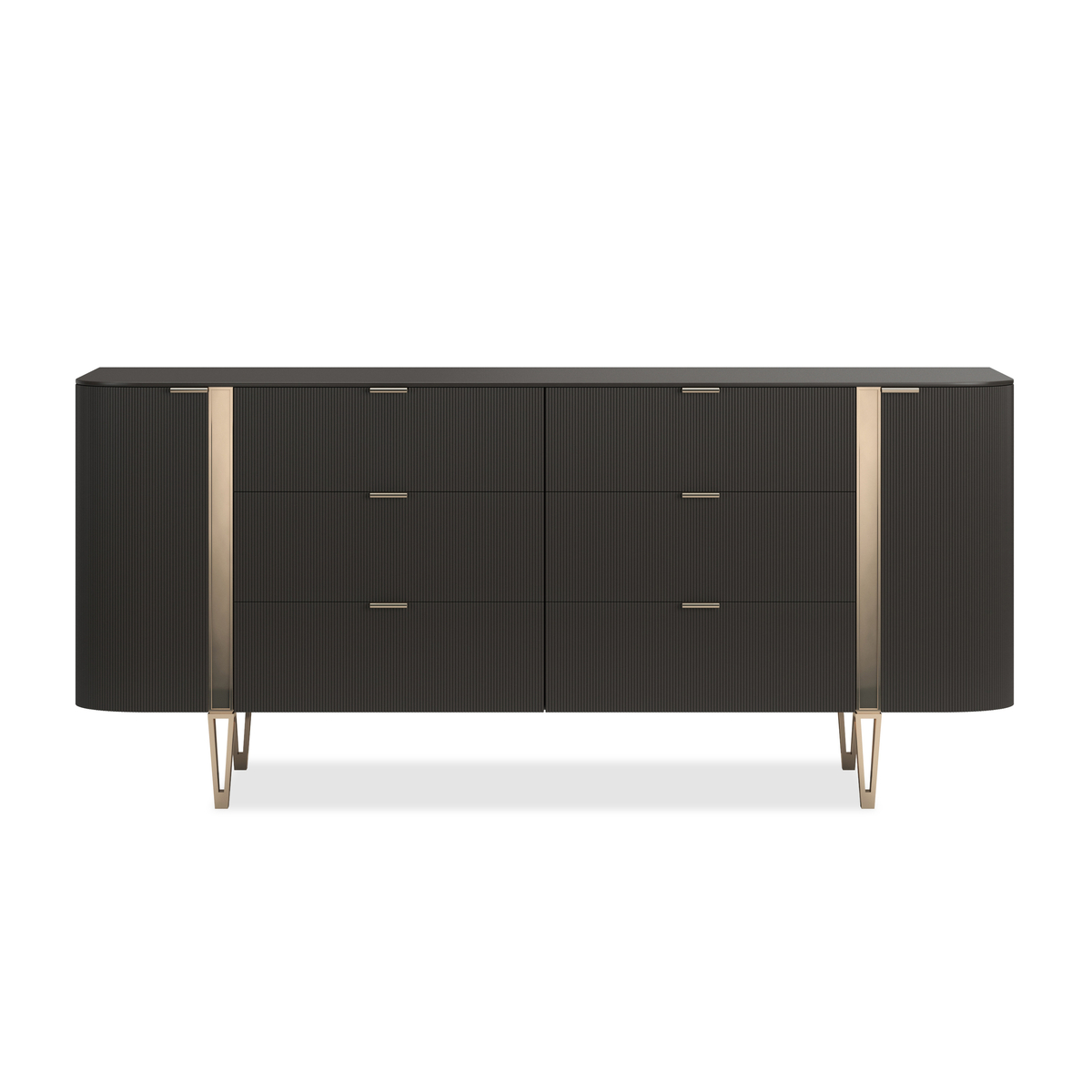 „Love At First Sight“ pailginta- iki 198 cm, su dviem galinėmis durelėmis, vidinėmis lentynomis ir šešiais centriniais stalčiais. “Dark Chocolate” danga paryškina išskirtinį fasadų apvadą su auksinės spalvos metalinėmis juostelėmis ir dizainerių sukurtomis kojelėmis. Baldas pasižymi grakščiai apvaliu stačiakampiu profiliu. Stalčiai iškloti veltiniu su apačioje esančiomis tvirtinimo kreipiančiosiomis.
