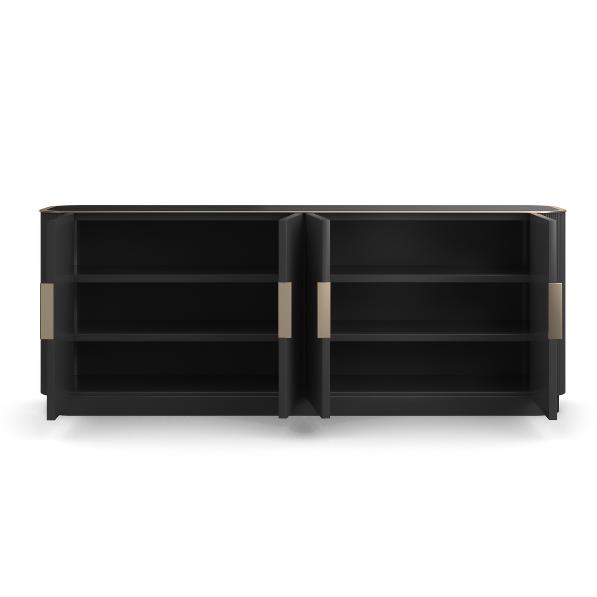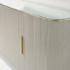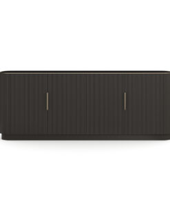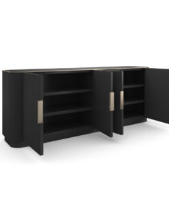 Sunku rasti moteriškumo žaismą turinčią indaują, tačiau ši grakšti ir prabangi konstrukcija, sukurs vietą jūsų mėgstamiausiems porcelianiniams indams ir papuoš svetainės zoną. Stačiakampio silueto su švelniais kampais, vertikaliai rievėtos detalės, paryškintos matine “Dark Chocolate” palete su unikalia aukso spalvos furnitūra. Ši prabangi komoda turi skaidrų stiklinį stalviršį įrėmintą “Whisper Of Gold” apdaila, keturias dureles, ir po dvi lentynas kiekvienoje nišoje.