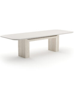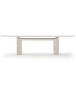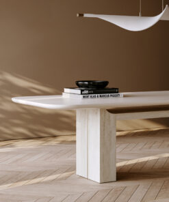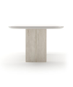 Stačiakampis valgomojo stalas „Overlap Rectangle“ pasižymi “Latte Gloss” spalvos stalviršiu, papuoštu auksiniais „Whisper of Gold“ raštais ir paremtu neužpildytais travertino akmens stovais. Rafinuotas dizainas suteikia valgomojo erdvei modernios prabangos.