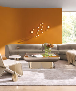 Kosmoso amžiaus įkvėpto dizaino ši daili sofa primena banguotą, lenktą estetiką epochos, kurioje menas ir vaizduotė buvo sujungti su pažanga ir inovacijomis. Kruopščiai pritaikytas, jos aptakų siluetą paryškina pilkšvai pilkas dirbtinio moherio aksomas vidinėje pusėje ir sidabro metalo spalvos audinys išorėje ir nugarėlėje. Jos apvalus cokolis su mikro raižytomis detalėmis sklandžiai derina klasicizmą ir industrinš stilių, sukurdamas unikalų „Caracole“ akcentą.