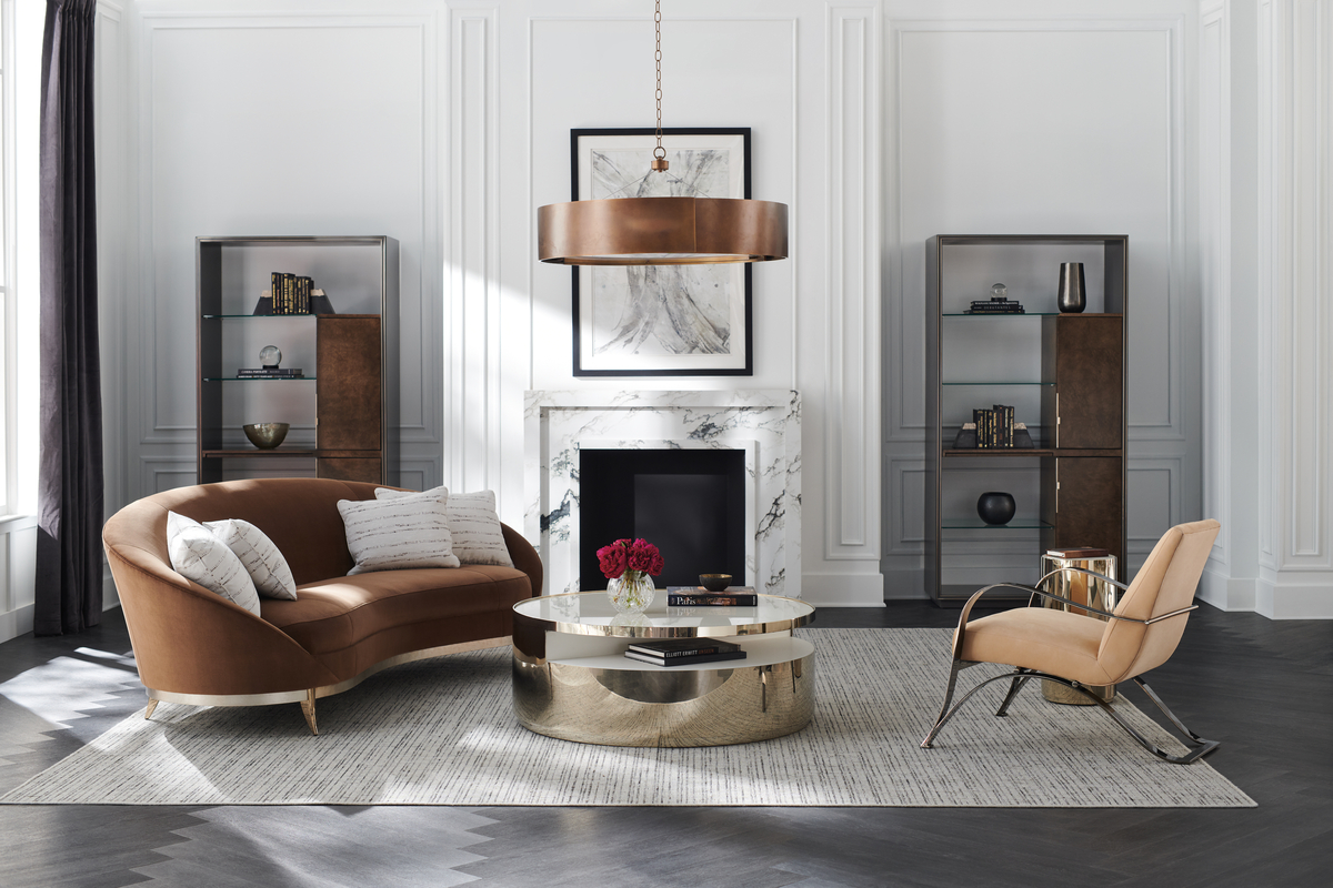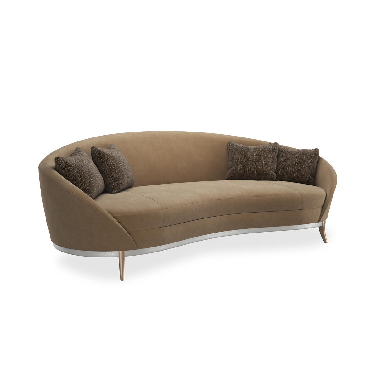 Ši prabangi, ikoniškos formos sofa, pasižyminti šiltu karamelės spalvos aksomu, siūlantį apgaubiantį komfortą. Grakščiai krentanti jos forma pasižymi lygiu atlošu ir išlenkta sėdima dalimi, o prancūziškos siūlės suteikia išskirtinį akcentą. “Bronze Plated” apdailos, kardo stiliaus kojelės iškelia lenktą medinį pagrindą, apdailintą “Dusty Silver” spalva, suteikiantį prabangos. Žvilgančio kirpto aksomo pagalvėlės suteikia jaukumo ir kontrasto.