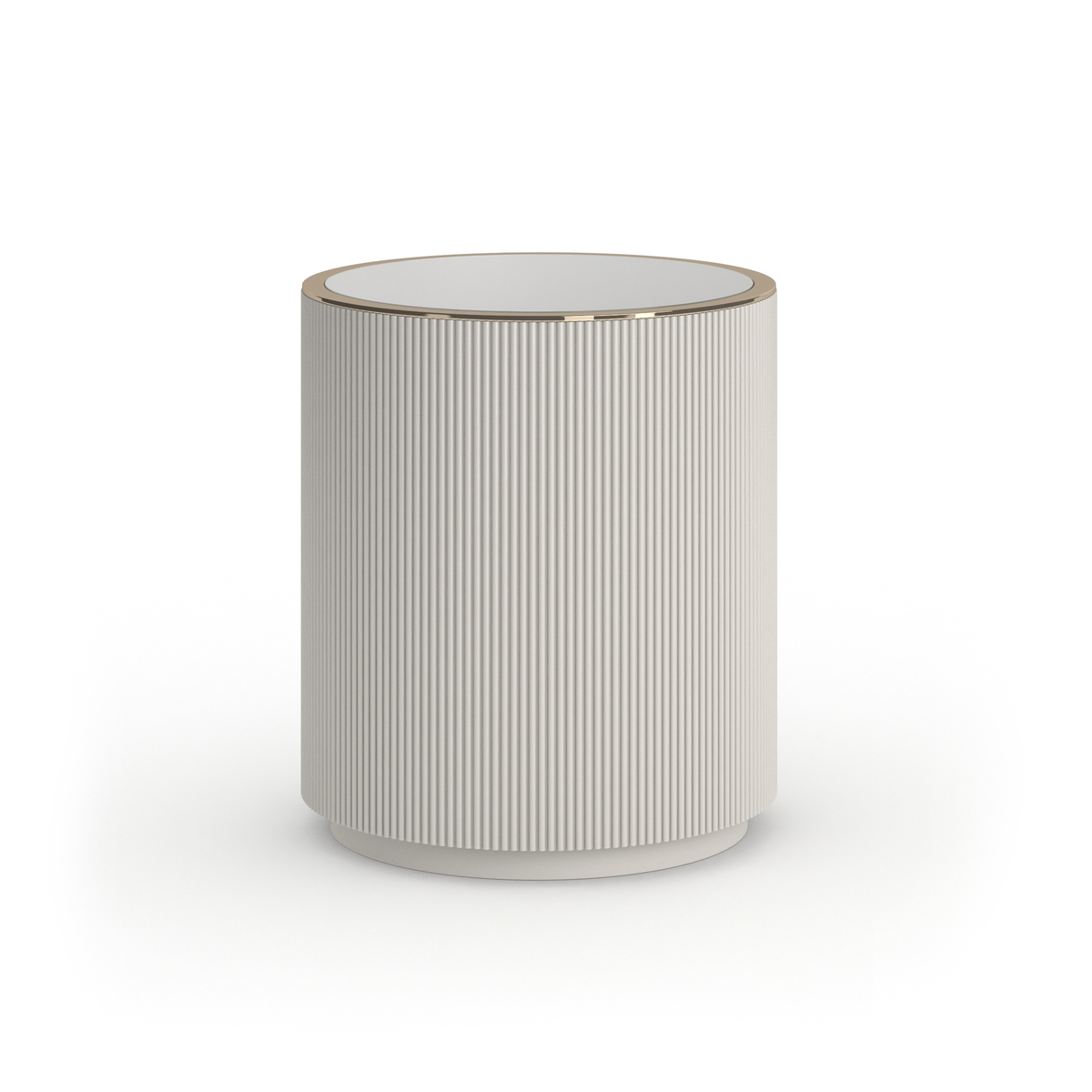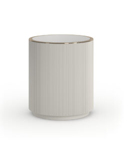 Toks nedidelis kolonos formos staliukas tinka bet kokiai erdvei. Stilingas dizainas, kuris turi skaidrų stiklinį stalviršį ir subtiliai rievėtą “Matte Pearl” spalvos korpusą. Vienu paspaudimu uždaromose durelėse su „Whisper of Gold“ furnitūra atrasite vieną reguliuojamo dydžio lentynėlę su prie baldo derančia apdaila.