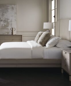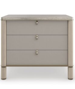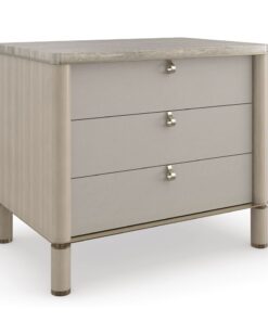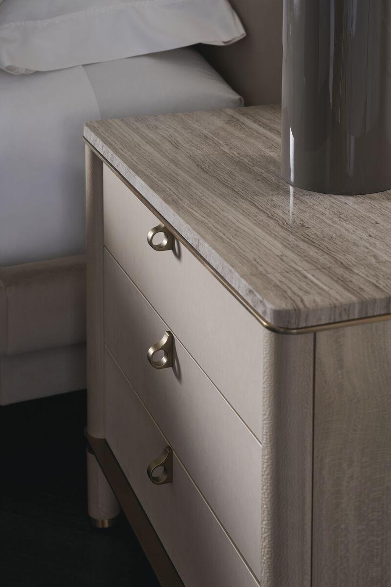 Tyliai viliojantis lovos palydovas, šis naktinis staliukas parodo medžiagos ir formos pusiausvyrą. Minkšti liesti, vinilu aptraukti stalčiai, papildyti sidabro platano medienos lukštais ir poliruoto travertino akmens viršumi. Metaliniai akcentai ir “Lucent Bronze” pagrindas suteikia šilumos ir subtilaus kontrasto.