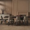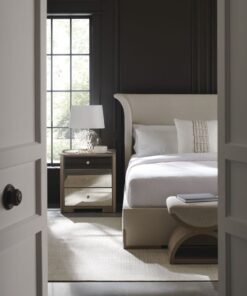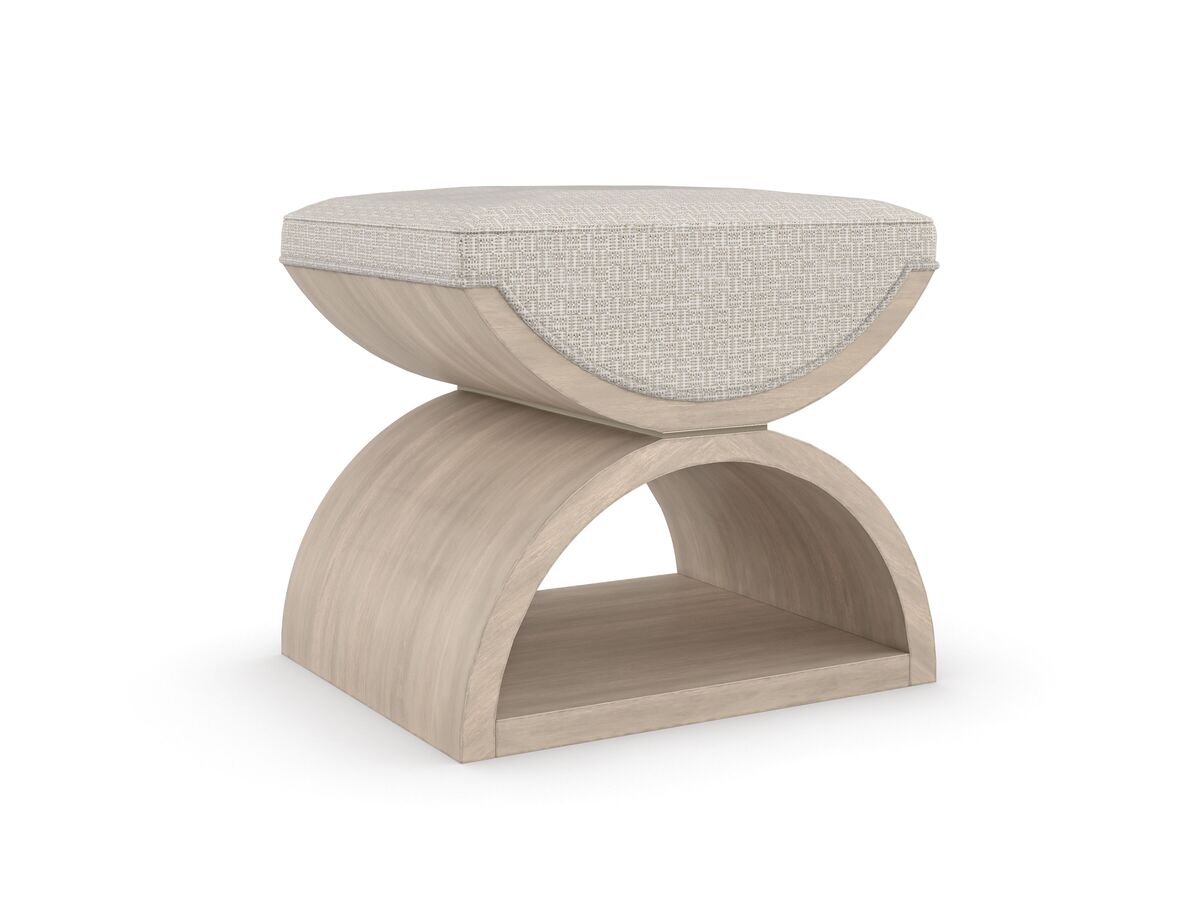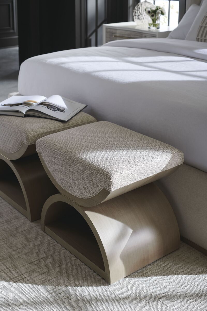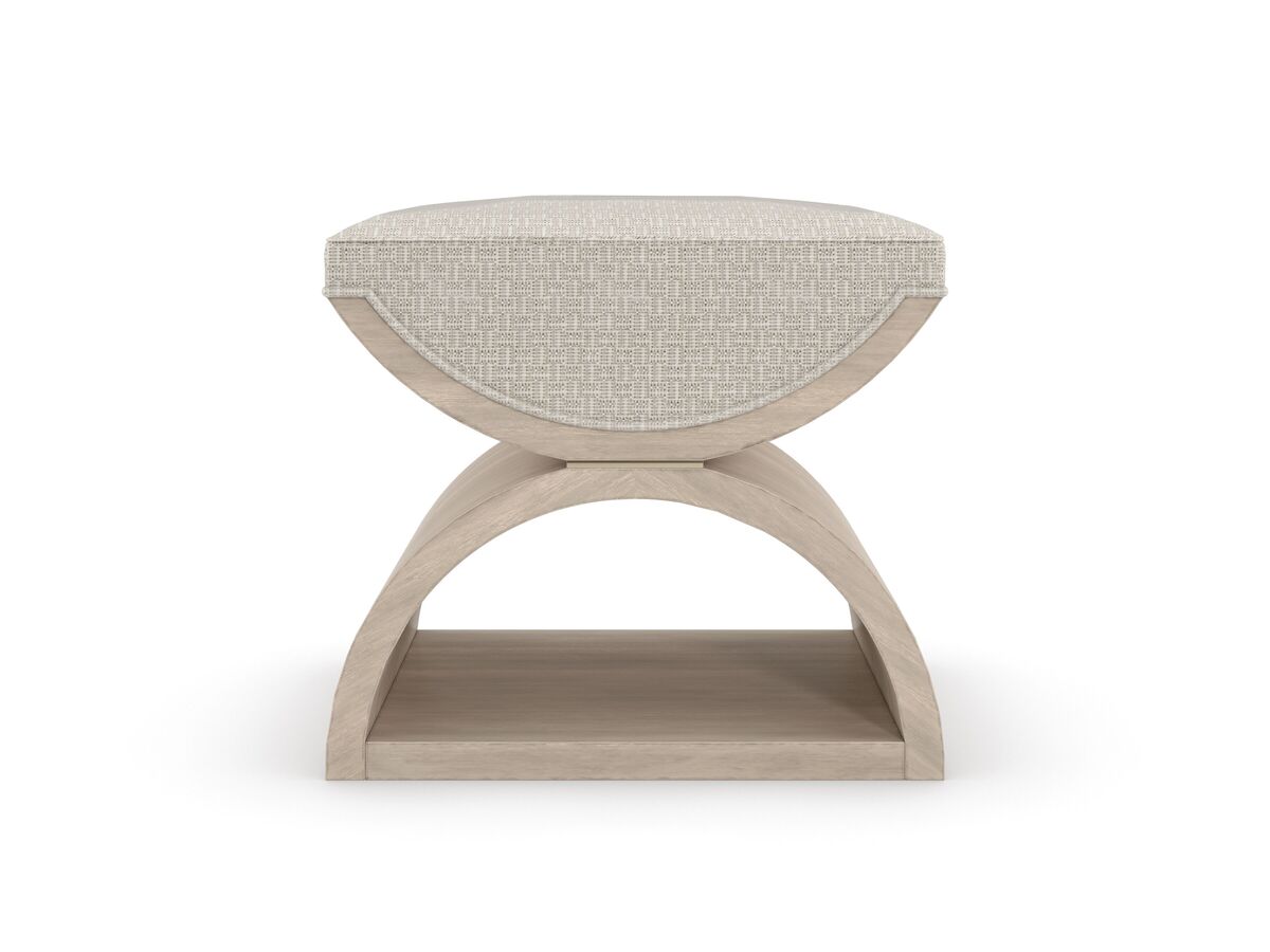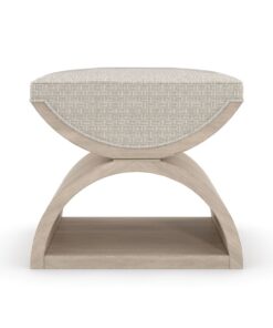 Įkvėptas neoklasicistinio dizaino, šis dvigubas U formos pufas suteikia modernų požiūrį į „Curule“ suolą, datuojamą senovės Romos karališkaisiais dvarais. Universalus ir vizualiai viliojantis, jis atlieka suolelio arba pufo funkciją, o poromis pastatytas lovos gale, sukuria prabangią vietą rengtis. Prabangiai pasiūta iš austo geometrinio audinio su blizgančiais akcento siūlais, minkšta apmušta sėdynė remiasi į skulptūrinį medinį rėmą – dvi pusmėnulio formos dalis skiria plona „Majestic Gold“ juosta, rėmas- “Woodland Grey”.